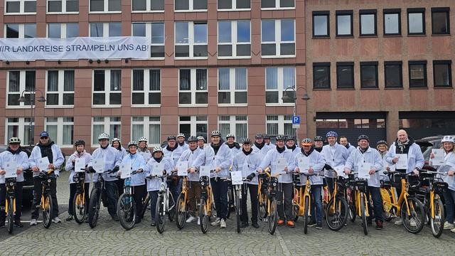 Die rheinland-pfälzischen schlagen Alarm und nehmen die künftige Landesregierung in die Pflicht. Unter dem Motto «Wir Landkreise strampeln uns ab!» starteten alle 24 Landrätinnen und Landräte im Land eine gemeinsame Fahrradaktion durch die Landeshauptstadt Mainz. Ziel war es, auf die finanziell angespannte Lage der Kommunen aufmerksam zu machen.