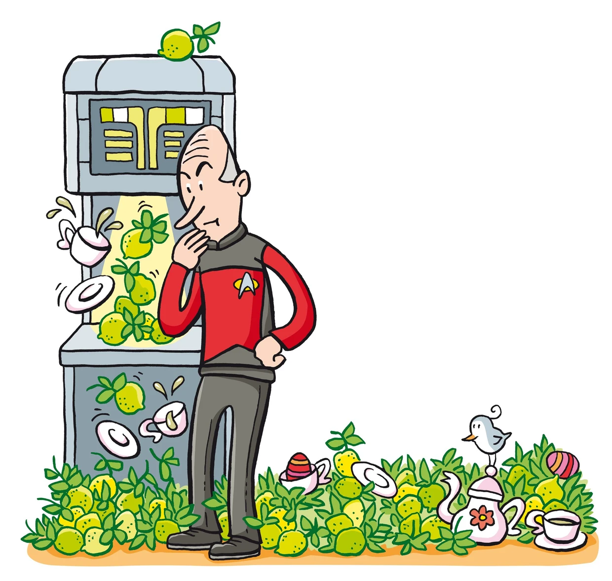 Liebhaber des Earl-Grey-Tees müssen hier aber keine Bedenken haben, selbst wenn sie nicht einen Großteil ihrer Zeit in einem Raumschiff statt an der Sonne verbringen. Der Tee enthält nur sehr geringe Mengen Bergamottöl – zu viel würde ihm ein seifiges Bouquet verleihen. Ohnehin kommt reines Bergamottöl nur bei den hochpreisigen Marken zum Einsatz. Im Earl Grey aus dem Supermarkt ist es mit anderen Zitrusölen gestreckt – und ganz billige Sorten enthalten gar keine Bergamotte. So wie ja auch Captain Picards Heißgetränk aus dem Replikator.