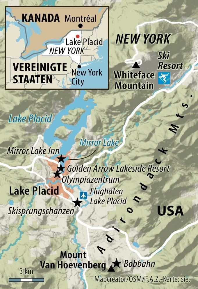 Dazu genügt ein Panoramablick von seiner Terrasse über den Ort und die nächste Umgebung. Vor uns liegt die Eisschnelllaufarena, in der 1980 ein weiteres Wunder geschah: Eric Heiden aus Wisconsin gewann als erster und bislang einziger Eisschnellläufer alle fünf Disziplinen vom Sprint bis zur Langstrecke, um sich danach ganz bescheiden ins Privatleben zurückzuziehen. Jetzt eifern ihm Dutzende von Schulkindern nach, die auf dem Oval nach Unterrichtsschluss ihre Runden drehen, oft bis spät in den Abend hinein, mit einer begeisterten Unermüdlichkeit, wie sie nur Kindern zu eigen ist. Im Süden ragen die beiden Skisprungschanzen von 1980 wie die Eiffeltürme von Lake Placid in den Himmel, ein paar Kilometer dahinter sehen wir am Mount Van Hoevenberg die Bahnen für Bob, Rodel und Skeleton neben dem Stadion für Langlauf und Biathlon. Im Westen ist der Whiteface Mountain mit seinen Pisten für die Alpinwettbewerbe zu erkennen. Und in allen Anlagen herrscht in den Wintermonaten kompetitiver Hochbetrieb inklusive eines halben Dutzends Weltcups, als könne Lake Placid gar nicht anders, als sich dem olympischen Wintersport mit Herz und Seele hinzugeben.