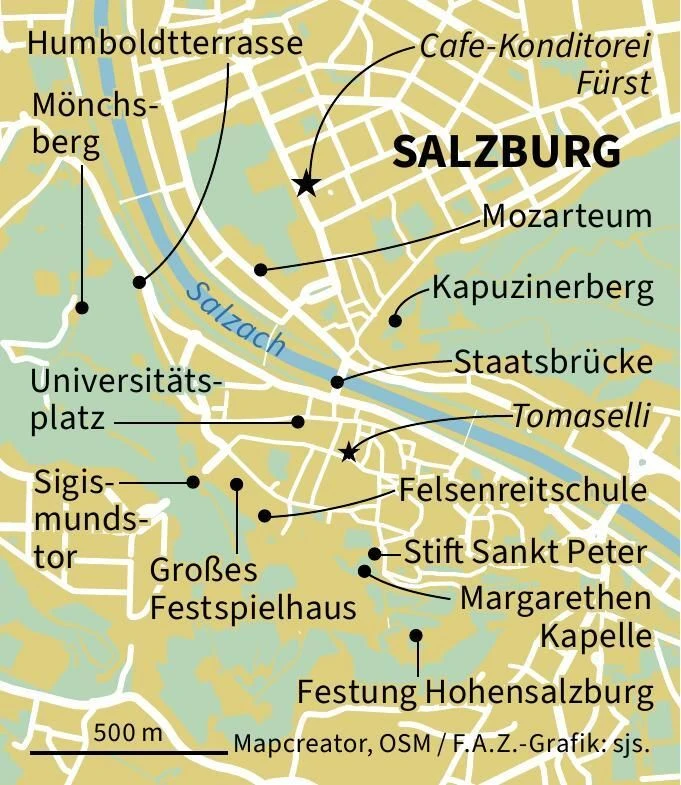Was würde er heute denken, sähe er die Touristenmassen, die sich in der Altstadt drängen, die Getreide-, Pfeifer-, Goldgasse verstopfen und sich im „Tomaselli“ von unhöflichen, hochnäsigen Kellnern drangsalieren lassen? Gleich gegenüber, in der Café-Konditorei Fürst, gibt es die hier kreierten, originalen Mozartkugeln, eingepackt in Silber und Blau, während die Industrieware an der roten Hülle zu erkennen ist. „Die richtigen Kugeln schmecken erst richtig, wenn man sie auf der Zunge langsam zerschmelzen lässt und die Pistazien schmeckt“, sagt Medi Gasteiner, die uns bei einem Braunen in die Salzburger Geheimnisse einweiht. „Niemals die rot eingepackten nehmen, die sind verboten, die gibt es nur in Deutschland und schmecken grausig.“